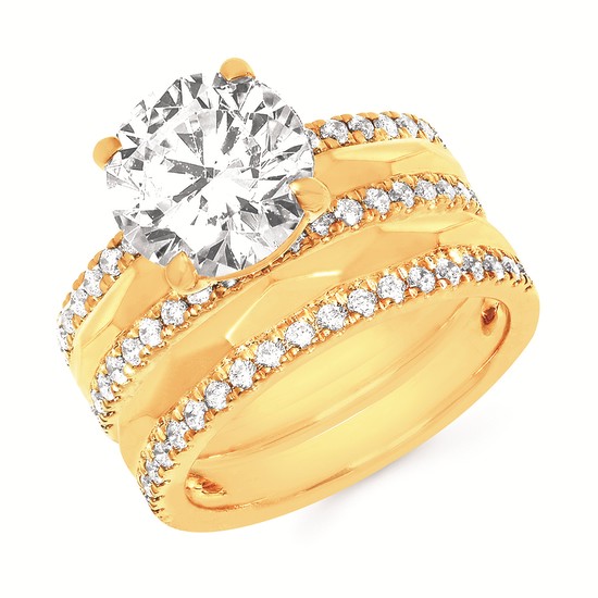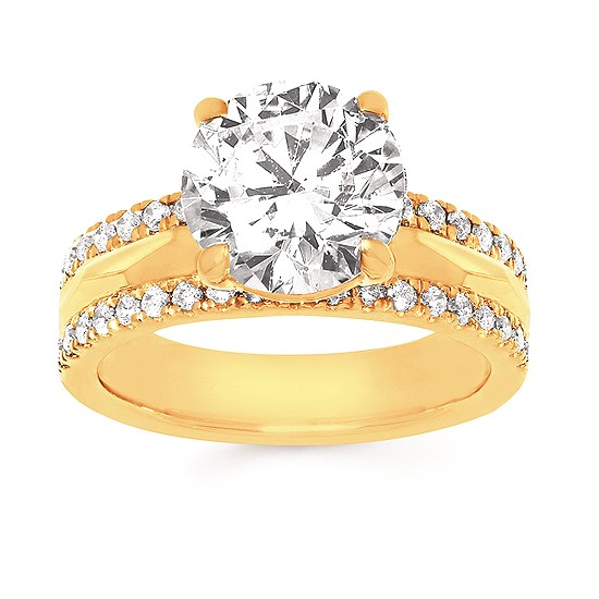 Modern Bridal: 3/8Ctw. Diamond Semi Mount shown with 3 Ct. Round Center Diamond in 14K Gold